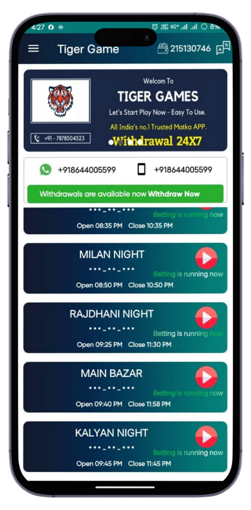 Play Online Tiger Games App is the most popular Satta Matka Website to play online Matka that provides the fastest Satta Matka Result and Satta Matka Jodi & Panel Numbers. Our website is famous for quick Play Online Tiger Games App Matka Result or Matka Tips. Play Online Tiger Games offers the chance to become a Satta Play Online Tiger Games using Our Satta Matka Result Online. Play Online Tiger Games mostly welcomes you in the popular Satta Matka World. This is totally official and 100% secure Matka site for real Matka players. This is the world’s most famous Online Satta website love by every Satta Matka player. Engaged in Satta Bazar We provide quickest and Super Results and error-free predictions. We are the only one who can help you big in earning huge money.